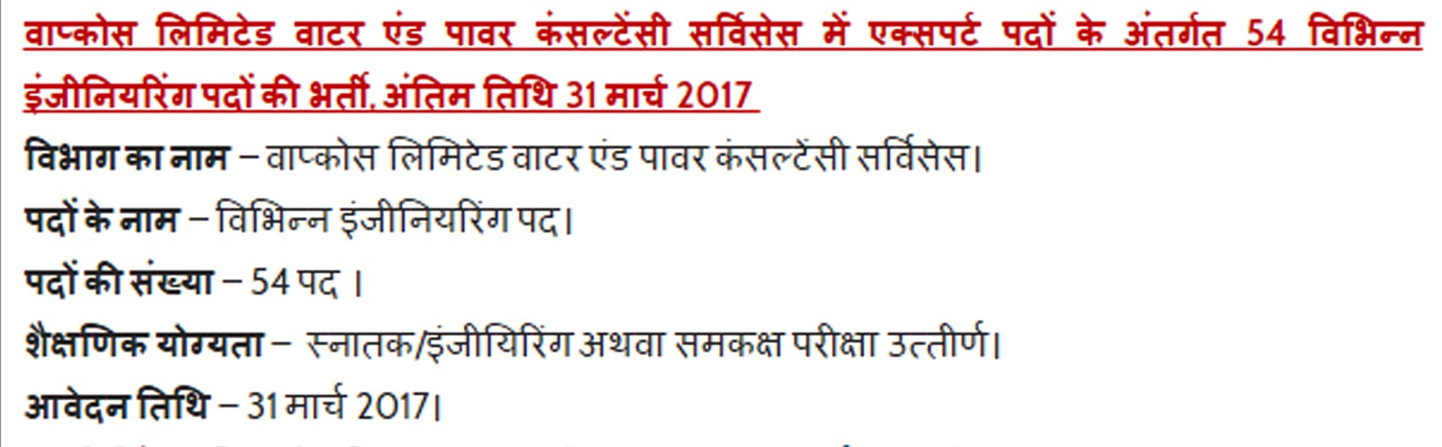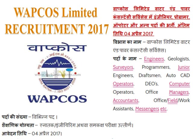 WAPCOS Limited Recruitment : वाप्कोस लिमिटेड वाटर एंड पावर कंसल्टेंसी सर्विसेस में विभिन्न पदों की भर्ती, अंतिम तिथि फरवरी, मार्च और अप्रैल 2017 Recruitment Notification Application Form Recruitment Notification Application Form Recruitment Notification Application Form Share this: Share on X (Opens in new window) X Share on Facebook (Opens in new window) Facebook Like Loading... Related