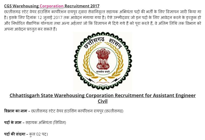 छत्सीसचाढ स्टेट बयर हाऊसिंग कापॉश्यान रायपुर दृद्रारा सतानिवृन्त सहायक अभियंता पर्दा कीं भर्ती क लिए विज्ञापन जारी किया आ