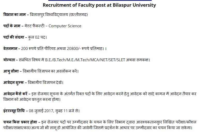 बिलासपुर विश्वविद्यालय द्वारा फैकल्टी पदों की भर्ती के लिए दिनांक 08 जुलाई 2017 को वॉक इन इंटरव्यूह के तहत आवेदन मंगाया गया है। ऐसे उम्मीदवार जो इन पदों के लिए आवेदन करने के इच्छुक हो और निर्धारित शैक्षणिक योग्यता तथा अन्य अर्हताएं जो कि विज्ञापन में दिये गये हैं को पूरा करते हैं, वे विभाग को अपना आवेदन प्रस्तुत कर सकते हैं।