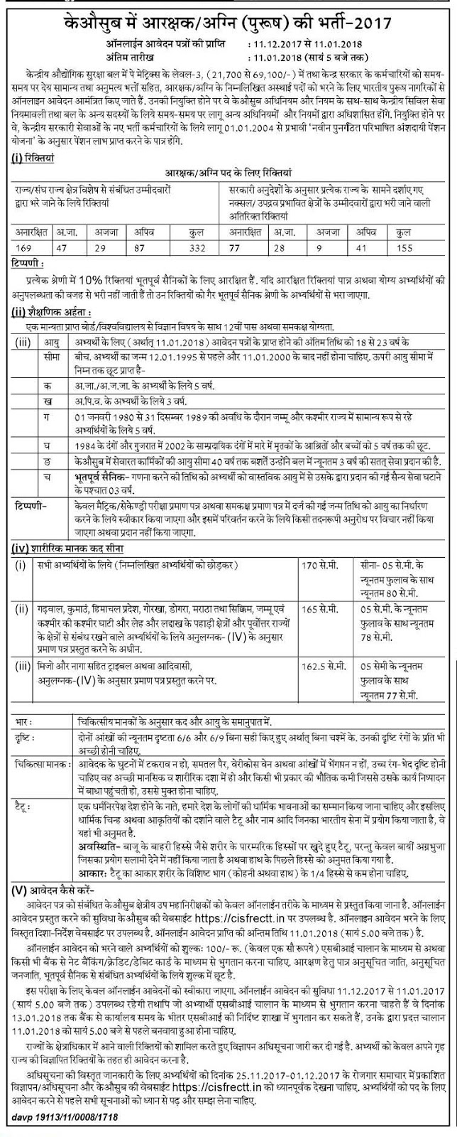 CISF 487 Constable Recruitment 2018 – Apply online for CISF Constable Vacancy