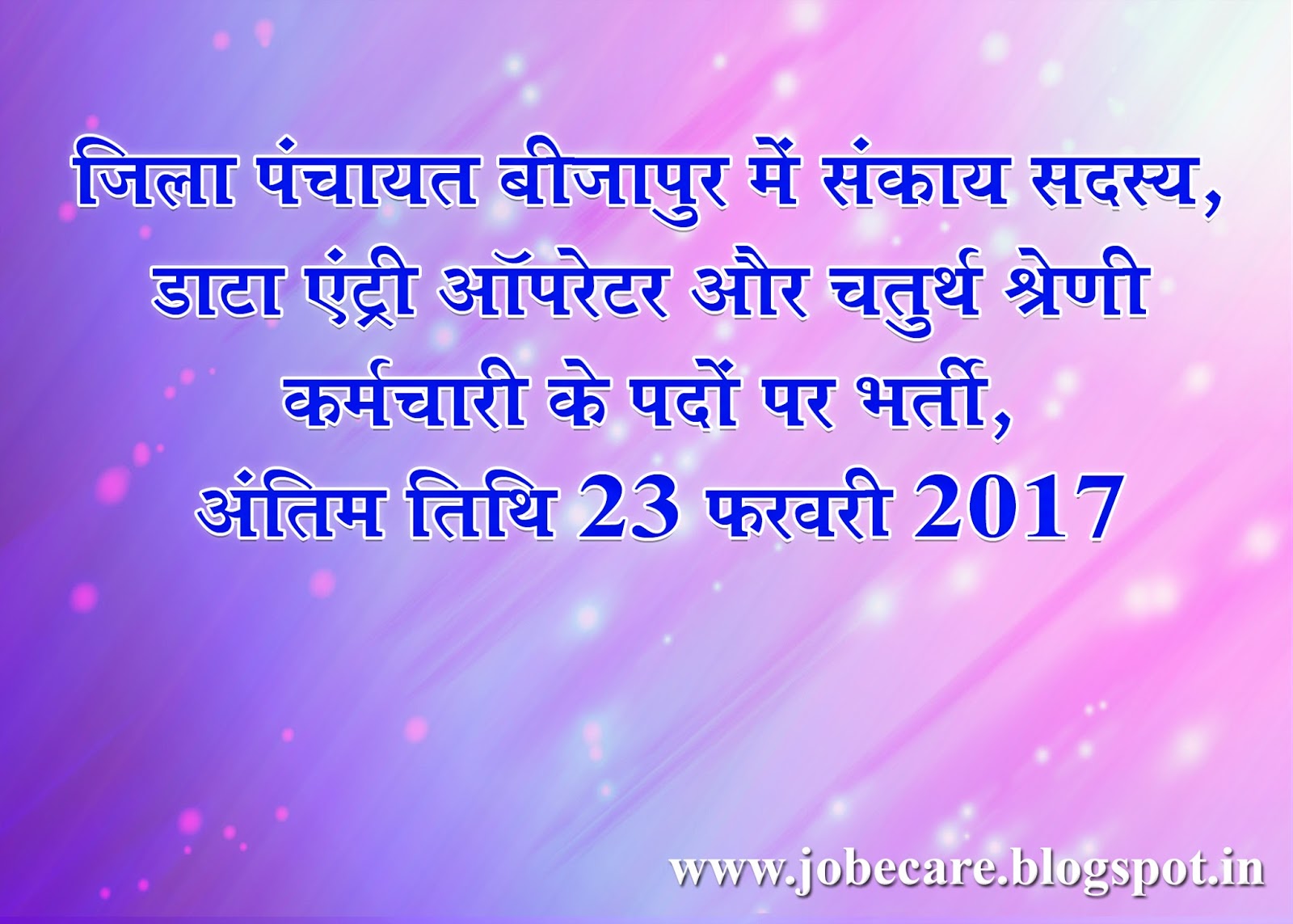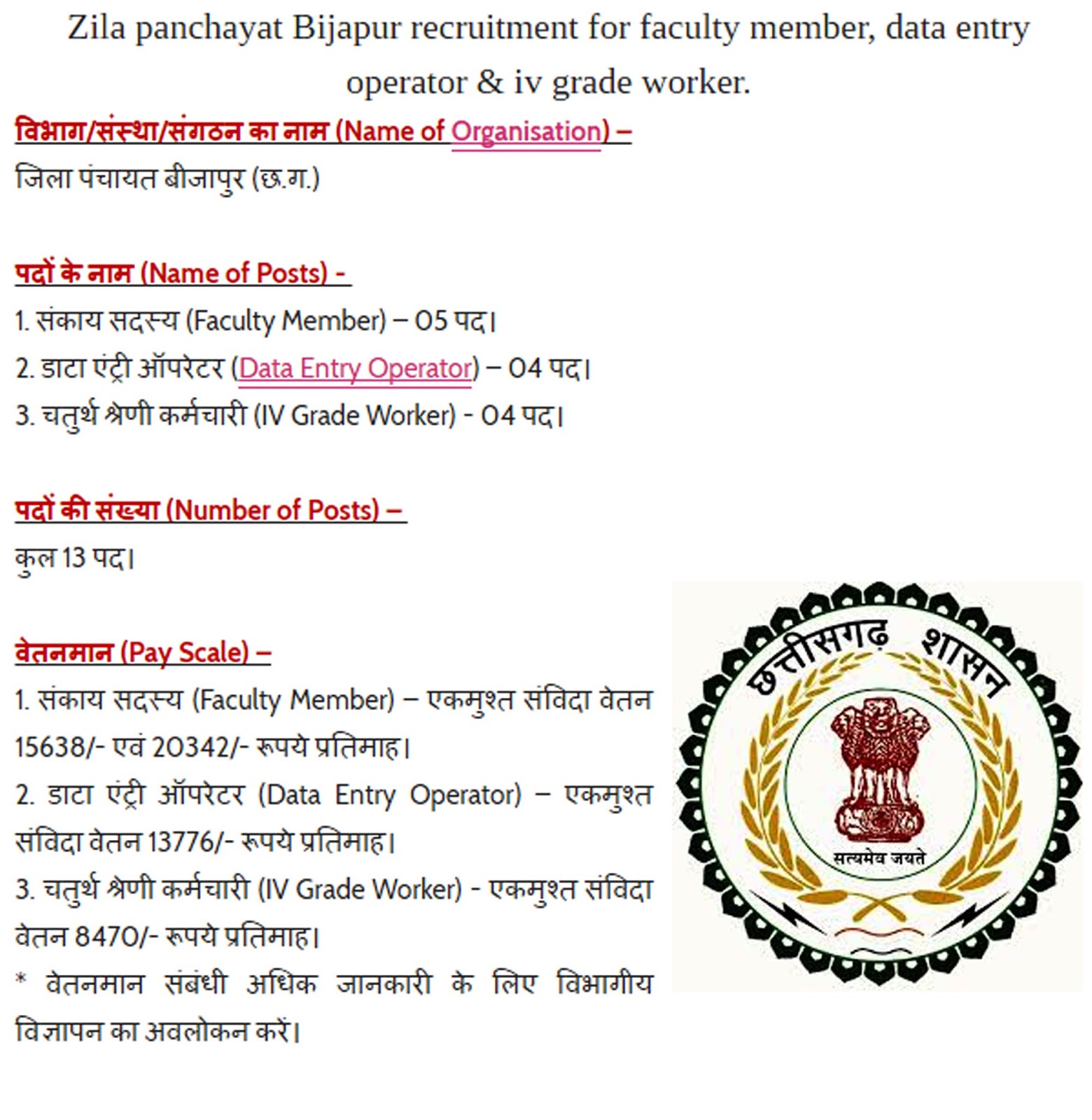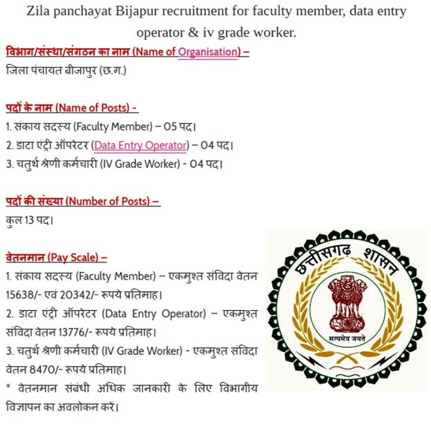 सभी उम्मीदवारों से अनुरोध है कि वे उपयुक्त पद के लिए पात्रता संबधी निर्देशों का अवलोकन भली-भांति कर लें एवं किसी भी विज्ञापन पर आवेदन करने से पहले अपने समझ से काम लेवें। कृपया सटिक एवं अधिक जानकारी के लिए विभागीय नोटिफिकेशन या विज्ञापन देखें। किसी भी स्थिति में विभागीय विज्ञापन में दिये गये निर्देश ही सही माने जावेंगे।