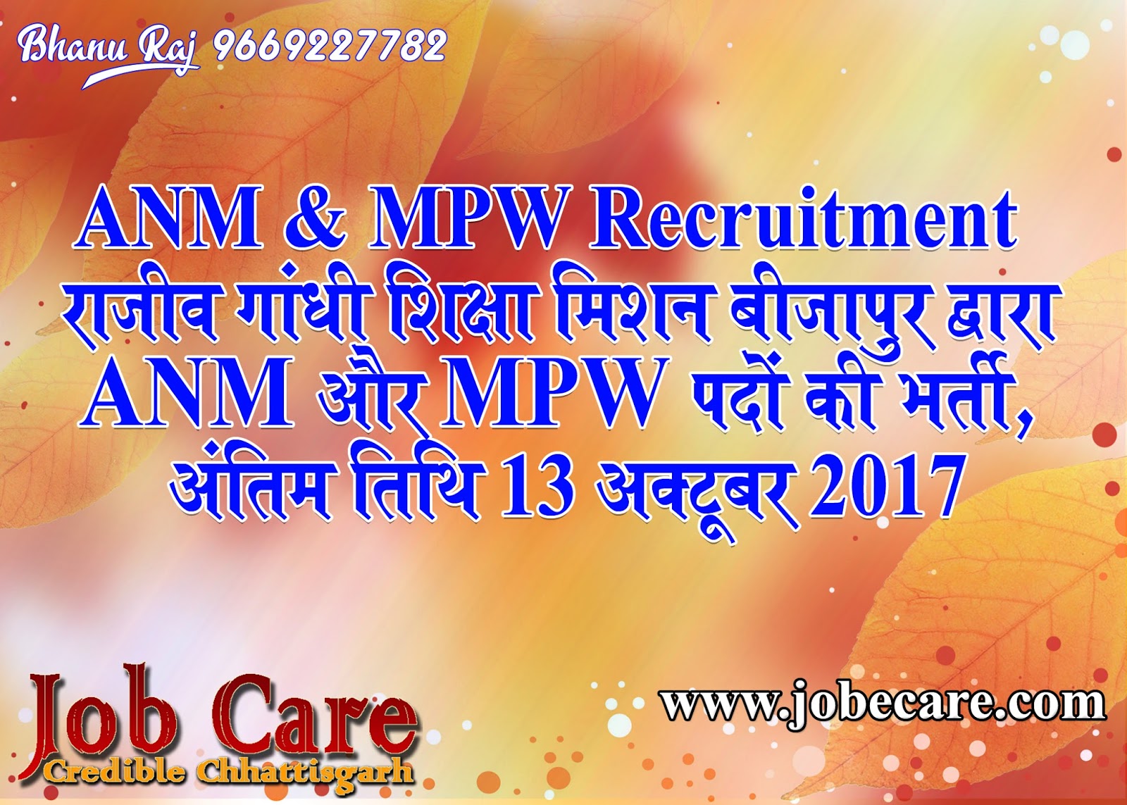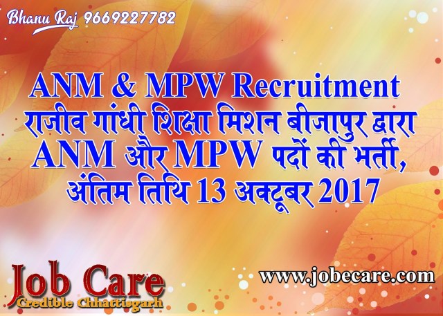 कार्यालय जिला परियोजना समन्वयक, राजीव गांधी शिक्षा मिशन बीजापुर द्वारा जिले के कन्या/बालक आवासीय विद्यालयों में अध्ययनरत छात्र/छात्राओं के स्वास्थ्य देखभाल हेतु महिला बहुद्देशीय स्वास्थ्य कार्यकर्ता (ANM) एवं पुरूष बहुद्देशीय स्वास्थ्य कार्यकर्ताओं (MPW ) के 34 विभिन्न पदों की भर्ती के लिए विज्ञापन जारी किया गया है। इसके लिए छ.ग. के स्थानीय/जिले के मूल निवासियों से दिनांक 13 अक्टूबर 2017 तक निर्धारित प्रारूप में आवेदन आमंत्रित किया गया है।