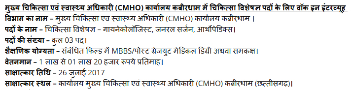 जिला पंचायत कबीरधाम में संकाय सदस्य पद की भर्ती हेतु रोजगार विज्ञापन प्रकाशित किया गया है। नोटिफिकेशन के अनुसार इन रोजगार पद के लिए दिनांक 16 अक्टूबर 2017 निर्धारित प्रारूप में आवेदन किया जा सकता है। इस भर्ती सूचना पर शैक्षिक योग्यता, वेतनमान, आयु सीमा और चयन प्रक्रिया जैसे विवरणों के बारे में जानने के लिए, विभाग द्वारा जारी आधिकारिक अधिसूचना नीचे दिये गये लिंक से डाउनलोड कर सकते हैं। यहां कुछ महत्वपूर्ण विवरण नीचे दिये जा रहें हैं।