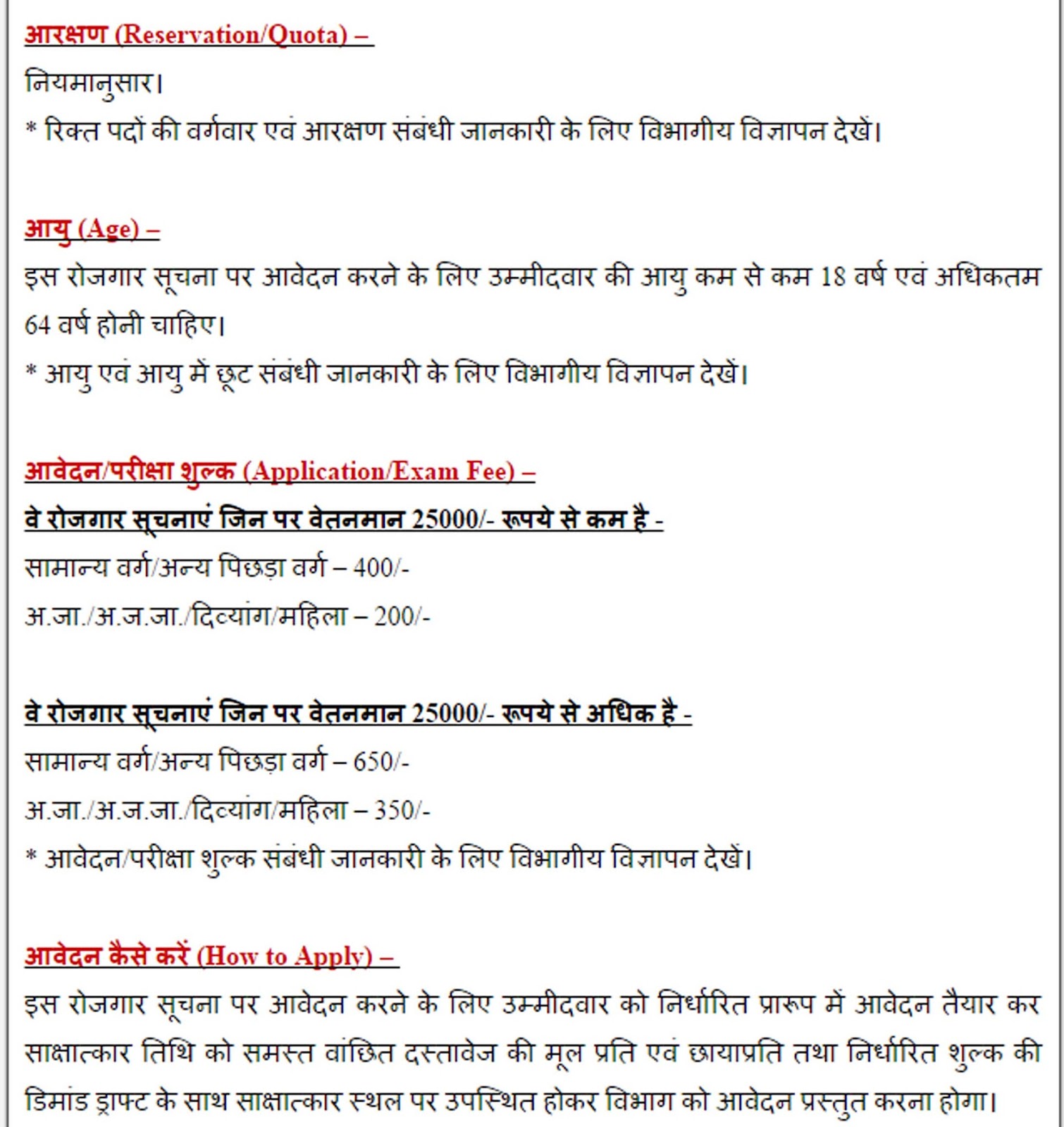 * आयुसीमा एवं आयु में छूट की जानकारी के लिए विभागीय विज्ञापन में दिये गये निर्देश देखें।