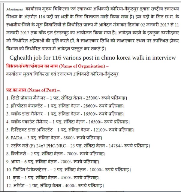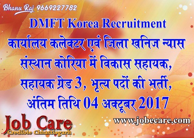 कार्यालय कलेक्टर एवं जिला खनिज न्यास संस्थान कोरिया द्वारा सहायक परियोजना समन्वयक, सहायक लेखाधिकारी, विकास सहायक, लेखापाल, सहायक ग्रेड 3 एवं भृत्य पदों की भर्ती के लिए विज्ञापन जारी किया गया है। इसके लिए छ.ग. के स्थानीय/जिले के मूल निवासियों से निर्धारित प्रारूप में दिनांक 04 अक्टूबर 2017 तक आवेदन आमंत्रित किया गया है।
