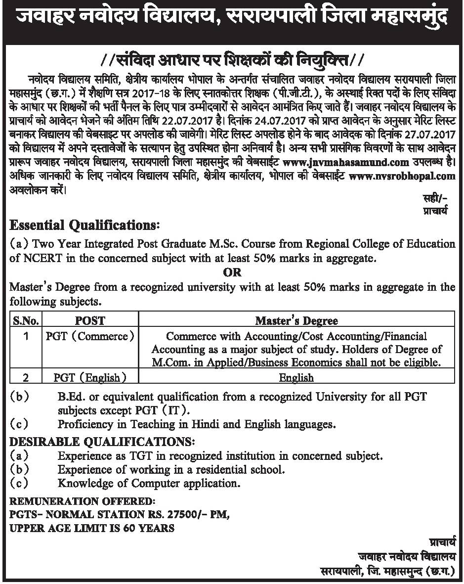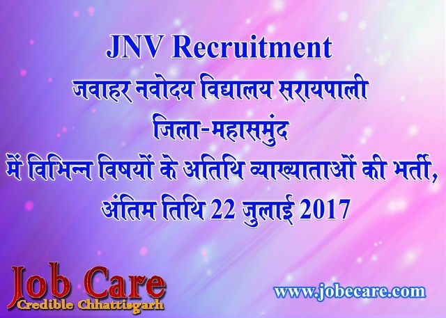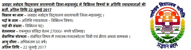 JNV Recruitment – जवाहर नवोदय विद्यालय सरायपाली जिला-महासमुंद में विभिन्न विषयों के अतिथि व्याख्याताओं की भर्ती, अंतिम तिथि 22 जुलाई 2017 Notification JNV MAHASAMUND OFFICIAL WEBSITE