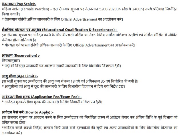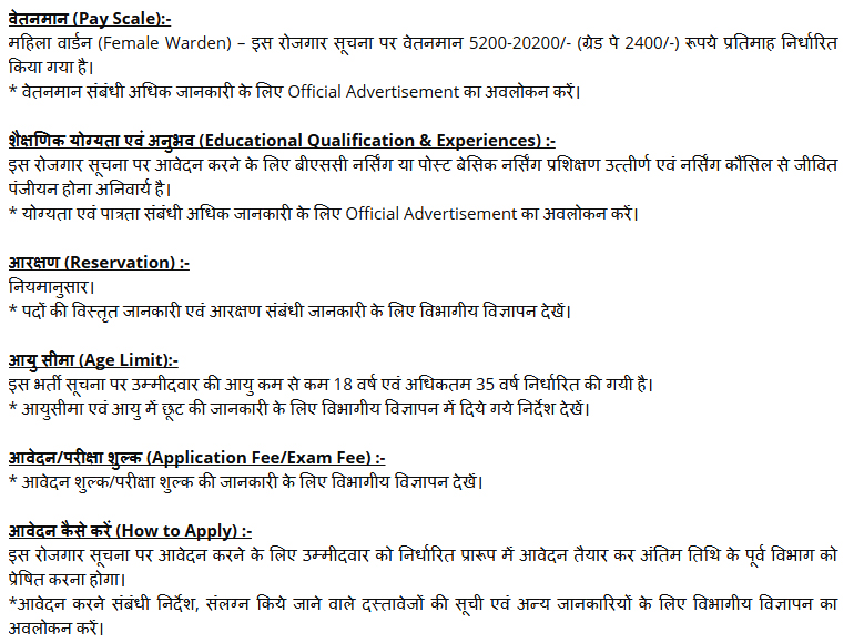 * पदों की विस्तृत जानकारी एवं आरक्षण संबंधी जानकारी के लिए विभागीय विज्ञापन देखें।