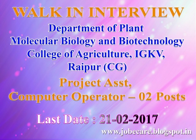 Walk-in-interview of the candidates fulfilling the essential qualification shall be held on 21.02.2017 at 11:00 am at the Department of Plant Molecular Biology and Biotechnology, IGKV, Raipur (CG). Interested candidates are required to submit their full bio-data along with attested copies of testimonials / certificate etc in support to their bio-data in office of Department of Genetics and Plant Breeding on or before 21.02.2017 up to 10.15 am and appear personally in interview on 21.02.2017 at 11:00 am in the department along with original documents and 3 passport size recent photographs. No TA/DA will be paid for attending the interview.