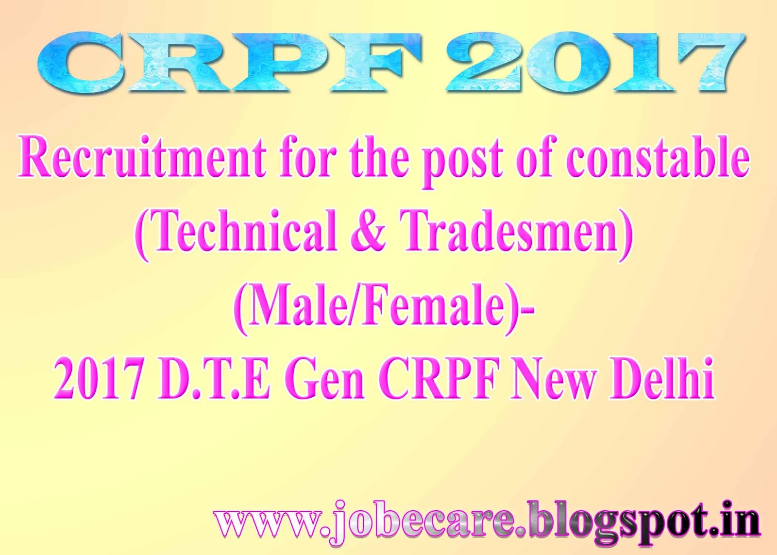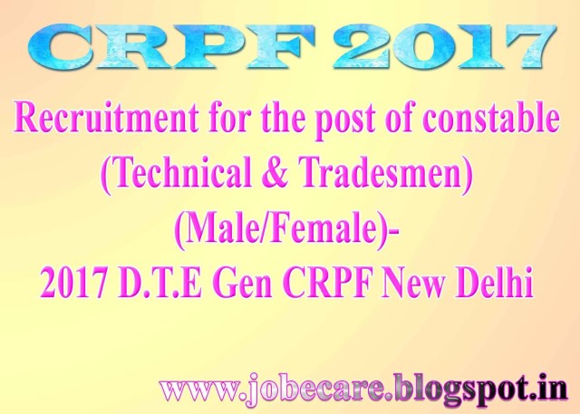 CRPF Recruitment for the post of constable (Technical & Tradesmen) (Male/Female)- 2017 D.T.E Gen CRPF New Delhi Last Date 01/03/2017