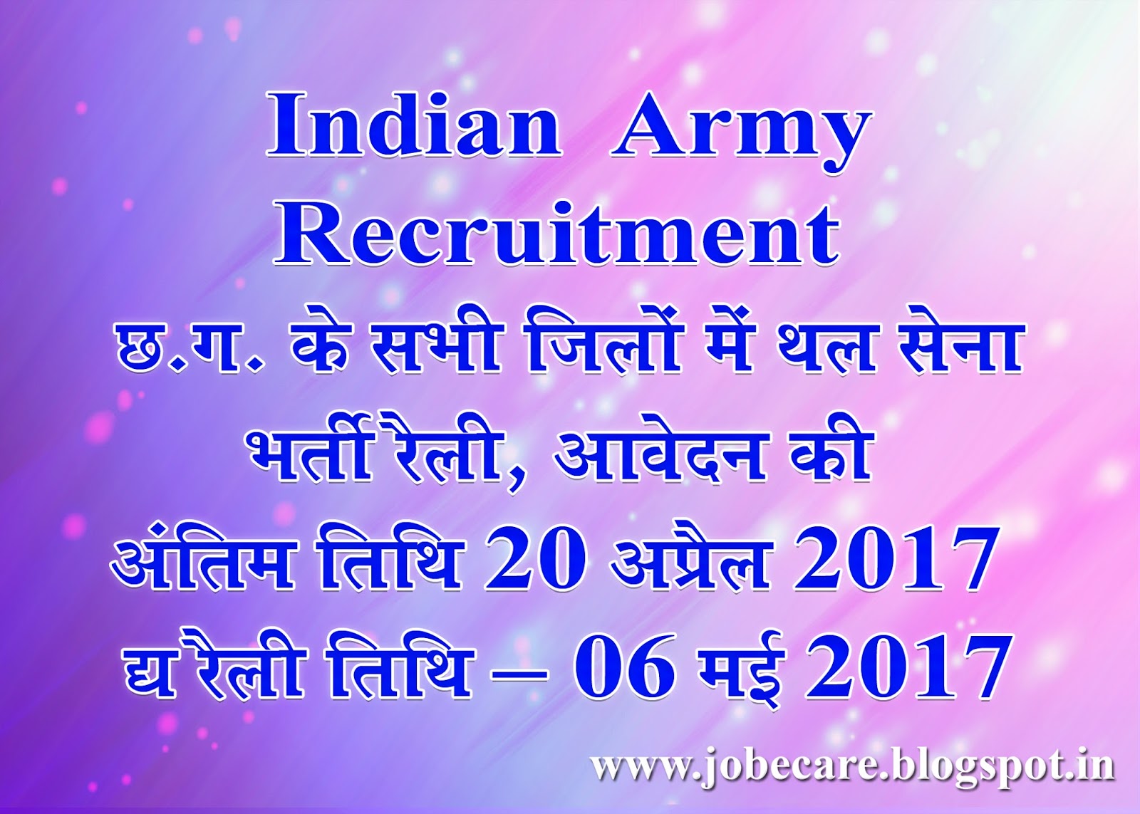 Indian-Army-jobs Recruitment : छ.ग. के सभी जिलों में थल सेना भर्ती रैली, आवेदन की अंतिम तिथि 20 अप्रैल 2017 | रैली तिथि – 06 मई 2017