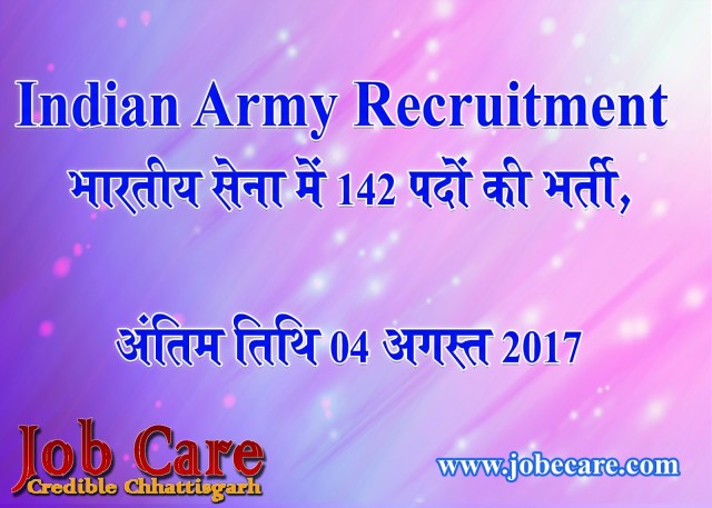 Indian Army Recruitment – भारतीय सेना में 142 पदों की भर्ती, अंतिम तिथि 04 अगस्त 2017