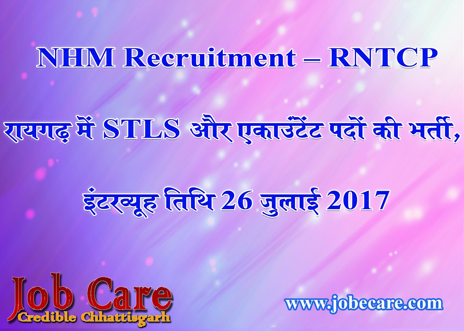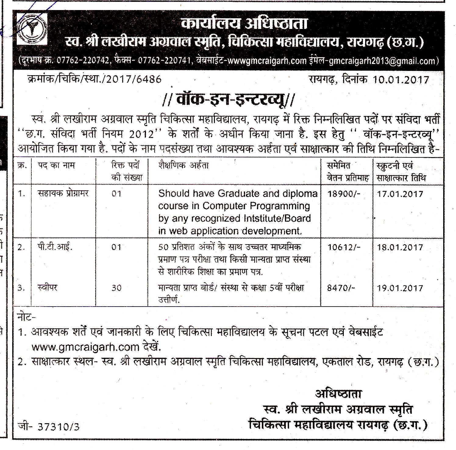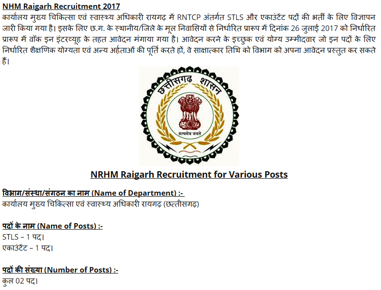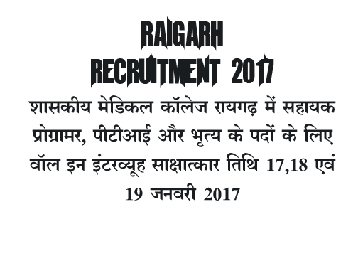 कार्यालय शासकीय नर्सिंग महाविद्यालय रायगढ़ ने वार्डन (महिला) पद पर सीधी भर्ती के लिए विज्ञापन जारी किया है। इसके लिए छ.ग. के स्थानीय/जिले के मूल निवासियों से निर्धारित प्रारूप में पंजीकृत डॉक्/स्पीड पोस्ट के माध्यम से दिनांक 15 सितम्बर 2017 तक आवेदन मंगाया गया है।