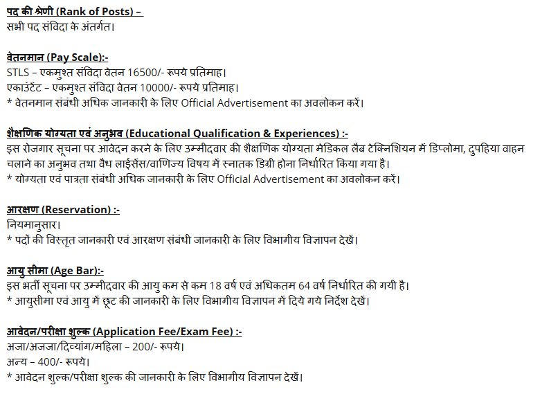 * रिक्त पदों की वर्गवार एवं आरक्षण संबंधी जानकारी के लिए विभागीय विज्ञापन देखें।