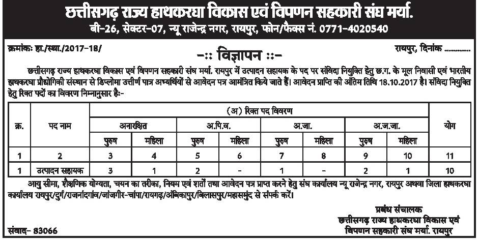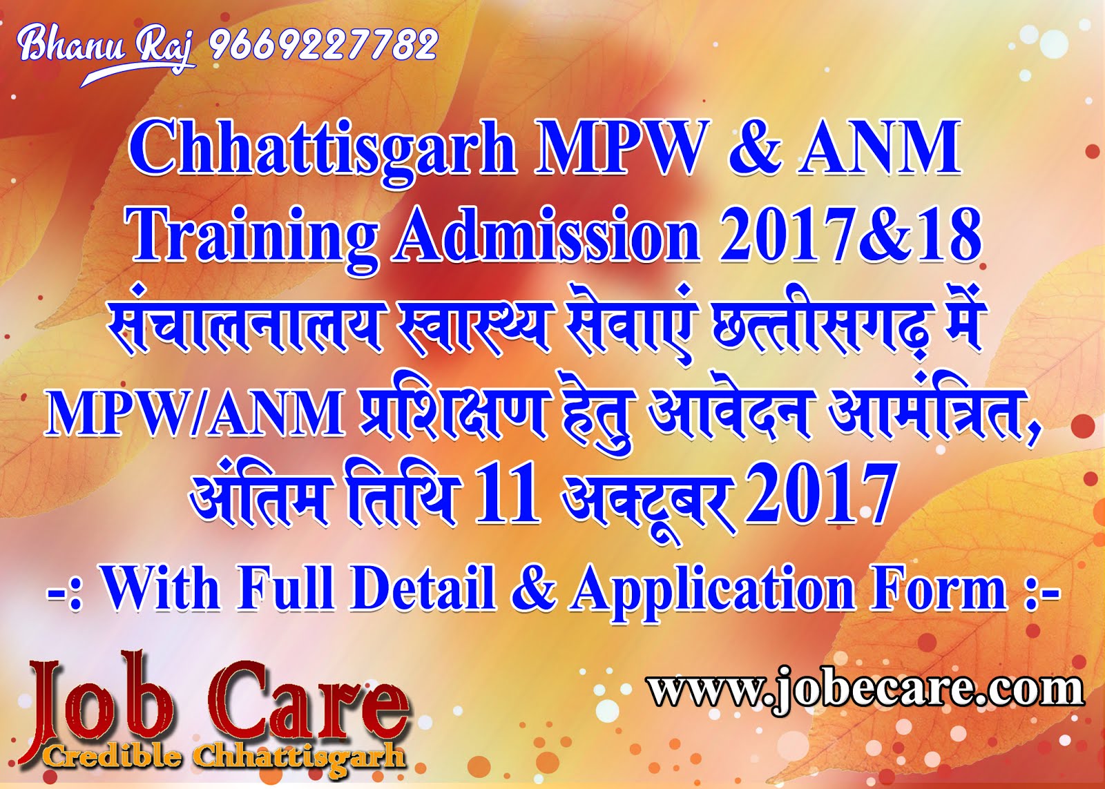 संचालनालय स्वास्थ्य सेवाएं छत्तीसगढ़ द्वारा पुरूष बहुद्देशीय स्वास्थ्यकर्ता (MPW)/ महिला बहुद्देशीय स्वास्थ्यकर्ता (ANM) प्रशिक्षण हेतु विज्ञापन जारी किया गया है। इसके लिए छ.ग. के स्थानीय/संबंधित जिले के मूल निवासियों से निर्धारित आवेदन प्रारूप में दिनांक 11 अक्टूबर 2017 तक आवेदन मंगाया गया है।