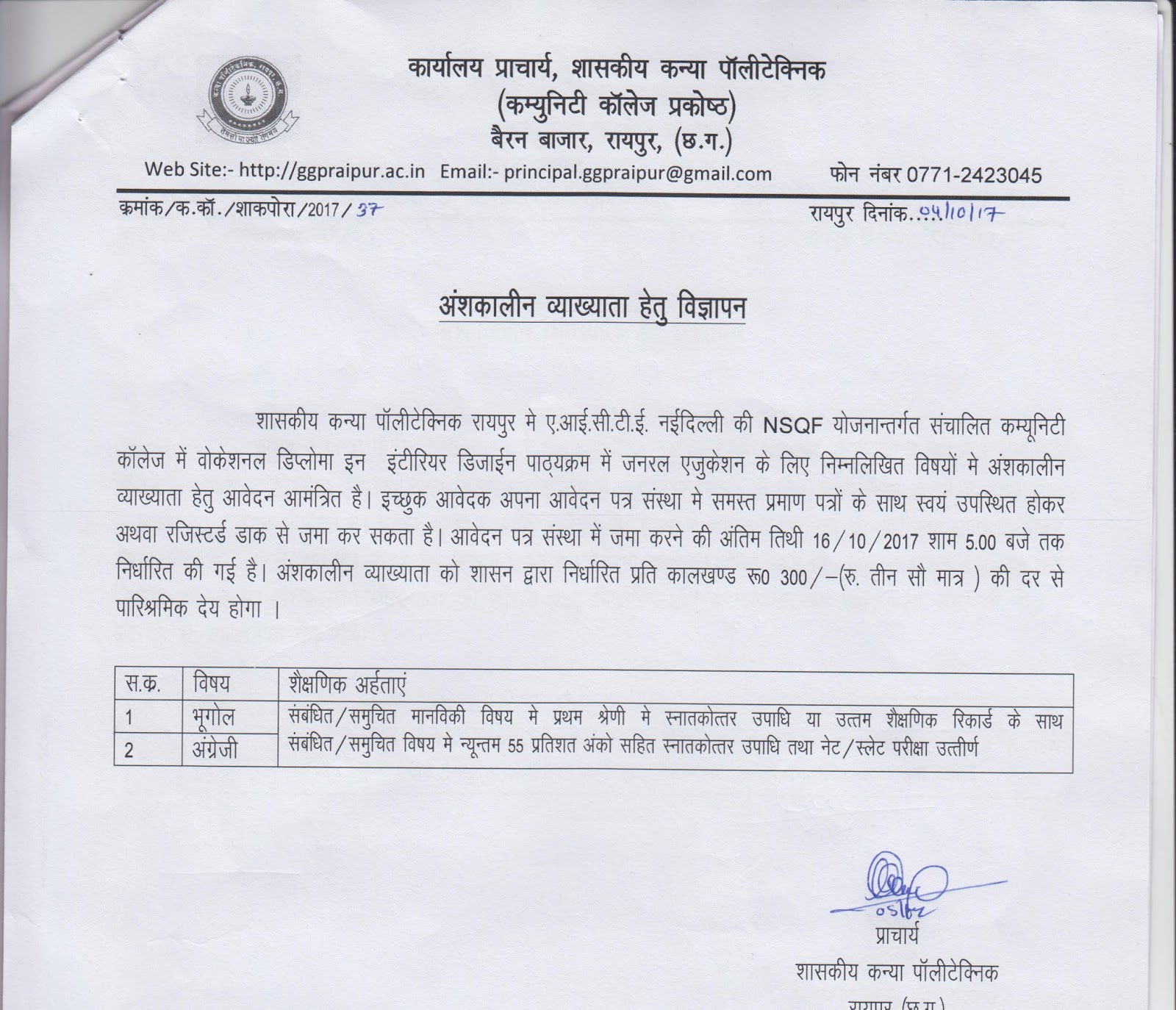सभी उम्मीदवारों से अनुरोध है कि वे उपयुक्त पद के लिए पात्रता संबधी निर्देशों का अवलोकन भली-भांति कर लें एवं किसी भी विज्ञापन पर आवेदन करने से पहले अपने समझ से काम लेवें। कृपया सटिक एवं अधिक जानकारी के लिए विभागीय नोटिफिकेशन या विज्ञापन देखें। किसी भी स्थिति में विभागीय विज्ञापन में दिये गये निर्देश ही सही माने जावेंगे।