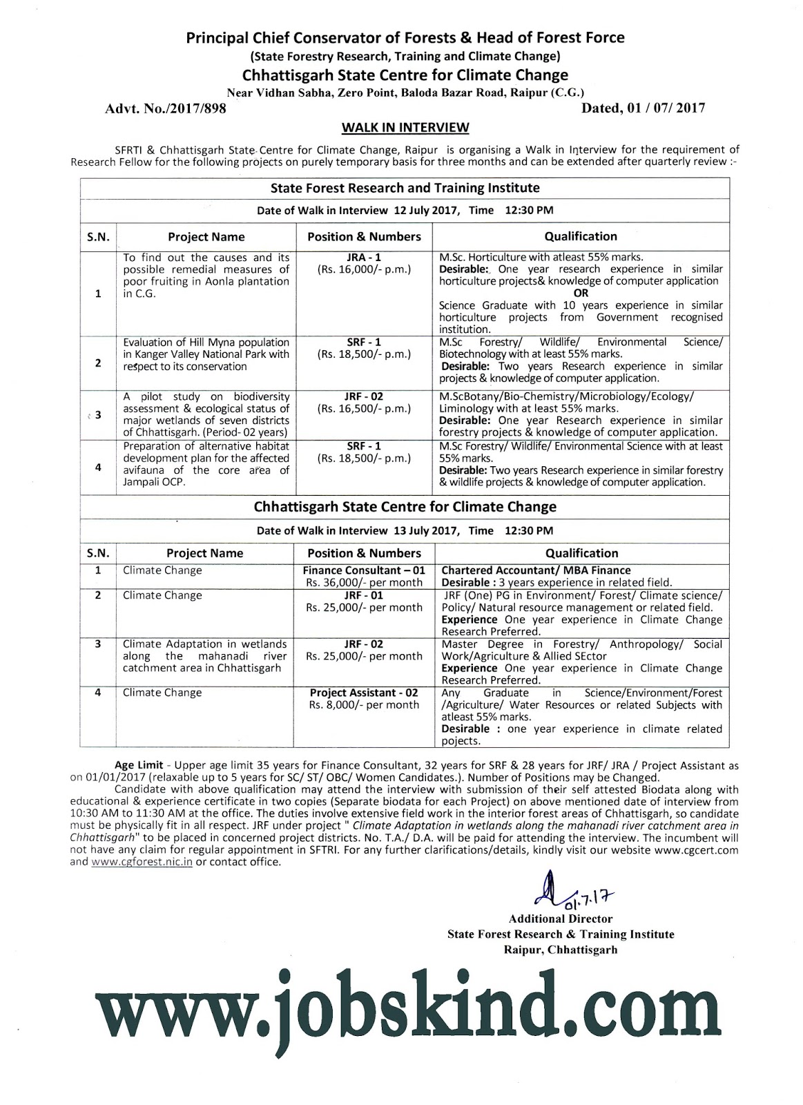 स्टेट फॉरेस्ट रिसर्च ट्रेनिंग एवं क्लाइमेट चेंज रायपुर छत्तीसगढ़ द्वारा JRA, SRF, Finance Consultant, JRF और प्रोजेक्ट असिस्टेंट पदों की भर्ती के लिए विज्ञापन जारी किया गया है। इन पदों के लिए छ.ग. के स्थानीय/जिले के मूल निवासियों से दिनांक 12 एवं 13 जुलाई 2017 को वॉक इन इंटरव्यूह के तहत आवेदन मंगाया गया है। योग्य एवं आवेदन करने के इच्छुक उम्मीदवार जो इन पदों के लिए निर्धारित शैक्षणिक योग्यता एवं अन्य अर्हताओं की पूर्ति करते हों, वे अंतिम तिथि के पूर्व विभाग को अपना आवेदन प्रेषित कर सकते हैं।