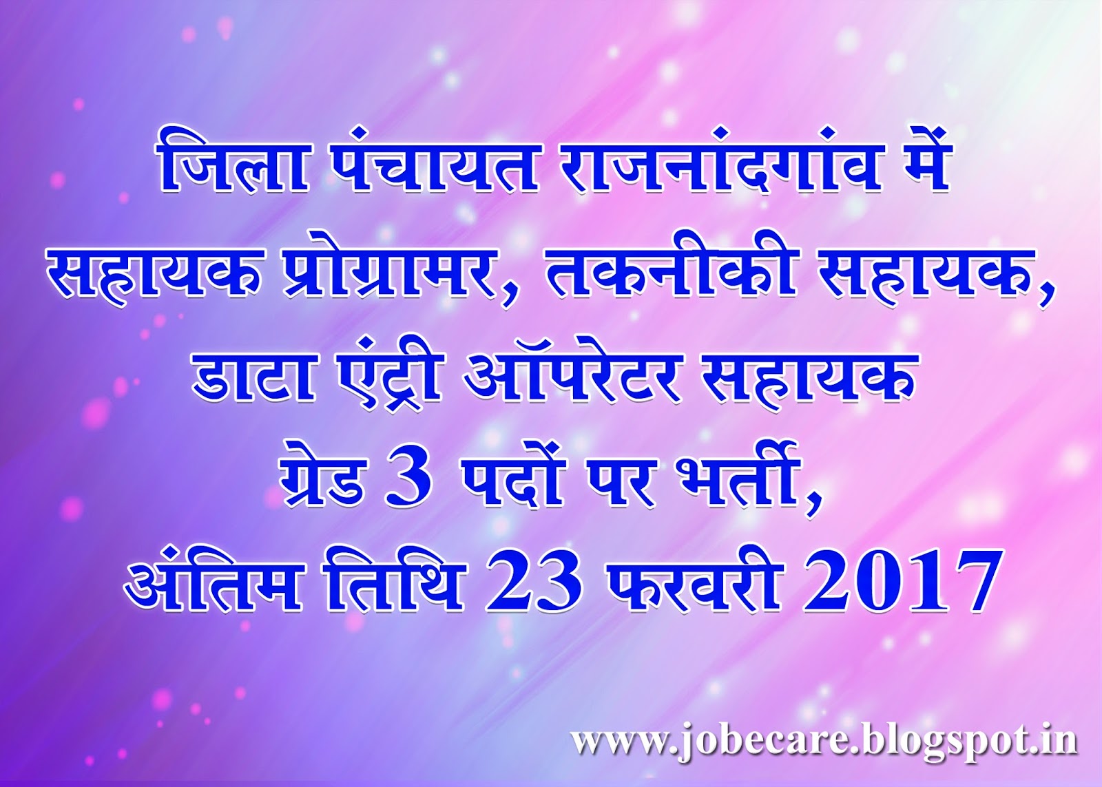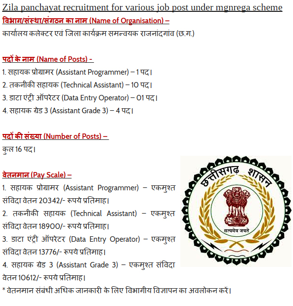 Zila Panchayat Job _ जिला पंचायत राजनांदगांव में सहायक प्रोग्रामर, तकनीकी सहायक, डाटा एंट्री ऑपरेटर और सहायक ग्रेड 3 पदों पर भर्ती, अंतिम तिथि 23 फरवरी 2017