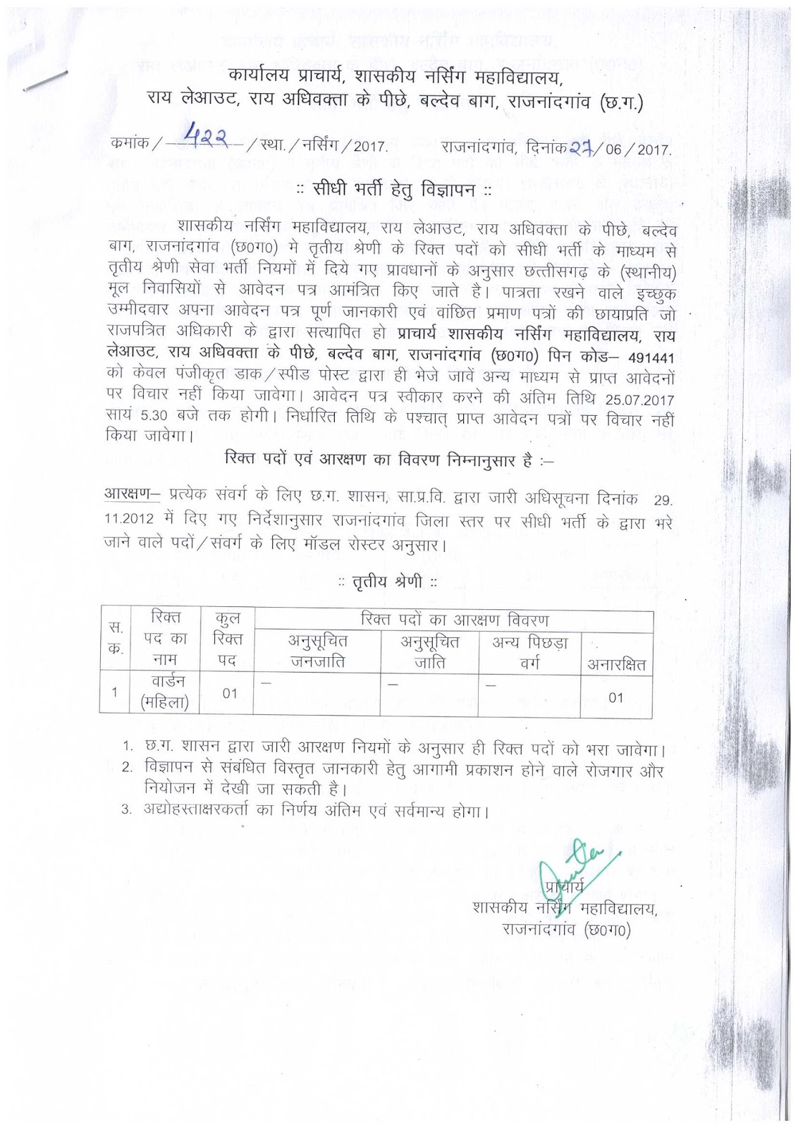 शासकीय नर्सिंग कॉलेज राजनांदगांव द्वारा महिला वार्डन पद की नियमित भर्ती के लिए विज्ञापन जारी किया गया है। इसके लिए छ.ग. के स्‍थानीय/जिले के मूल निवासियों से निर्धारित प्रारूप में दिनांक 25 जुलाई 2017 तक आवेदन मंगाया गया है। आवेदन करने के इच्‍छुक एवं योग्‍य उम्‍मीदवार जो इन पदों के लिए निर्धारित शैक्षणिक योग्‍यता एवं अन्‍य अर्हताओं की पूर्ति करते हों, वे अंतिम तिथि के पूर्व विभाग को अपना आवेदन प्रेषित कर सकते हैं।