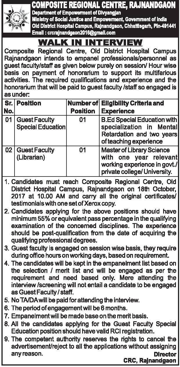 Rajnandgaon Recruitment – दिव्‍यांगजन सशक्तिकरण विभाग राजनांदगांव में गेस्‍ट फैकल्‍टी पदों की भर्ती, साक्षात्‍कार/दस्‍तावेज सत्‍यापन तिथि-18 अक्‍टूबर 2017