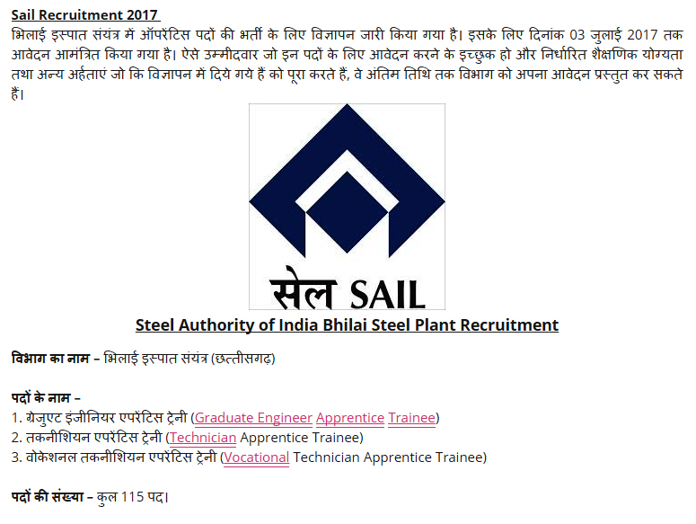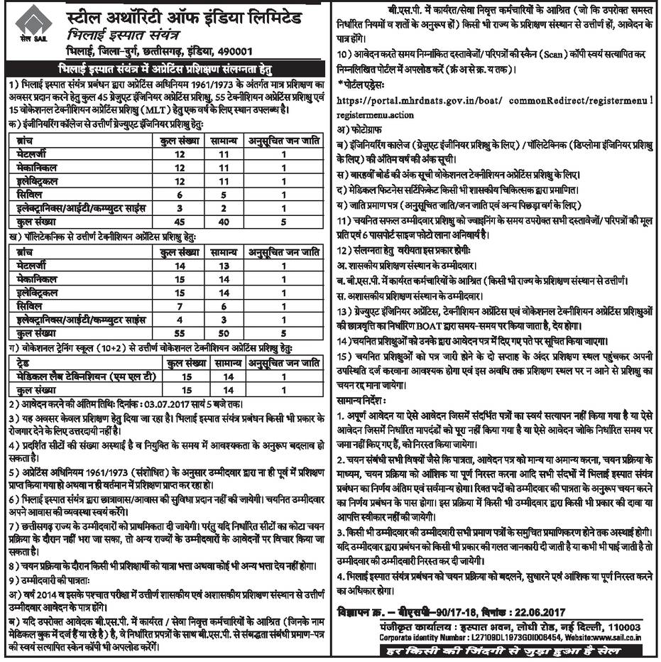Sail Recruitment – भिलाई इस्पात संयंत्र में आपरेंटिस पदों की भर्ती, अंतिम तिथि 03 जुलाई 2017 विभागीय विज्ञापन