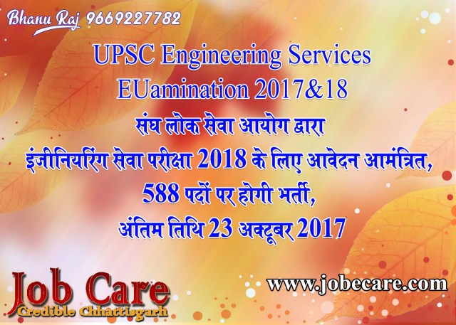 संघ लोक सेवा आयोग द्वारा इंजीनियरिंग सेवा परीक्षा 2018 के लिए विज्ञापन प्रकाशित किया गया है। इस परीक्षा के आधार पर इंजीनियरिंग के विभिन्न क्षेत्रों में 588 इंजीनियर की भर्ती की जानी है। इसके लिए दिनांक 23 अक्टूबर 2017 तक विभाग को ऑनलाईन आवेदन किया जा सकता है।