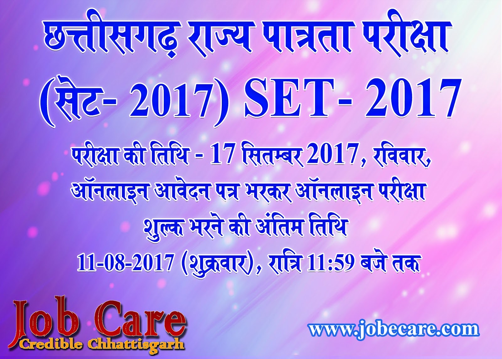 CG SET 2017 Recruitment – छत्तीसगढ़ राज्य पात्रता परीक्षा (सेट) 2017, आवेदन तिथि 22 जुलाई 2017 से 11 अगस्त 2017