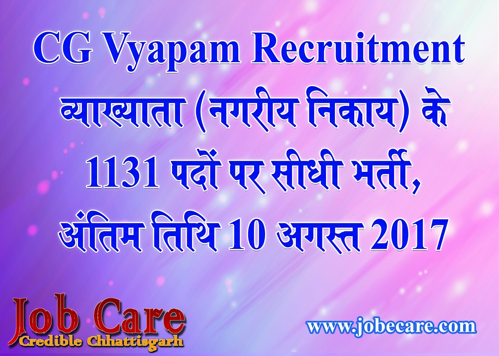 CG Vyapam Recruitment – व्याख्याता (नगरीय निकाय) के 1131 पदों पर सीधी भर्ती, अंतिम तिथि 10 अगस्त 2017