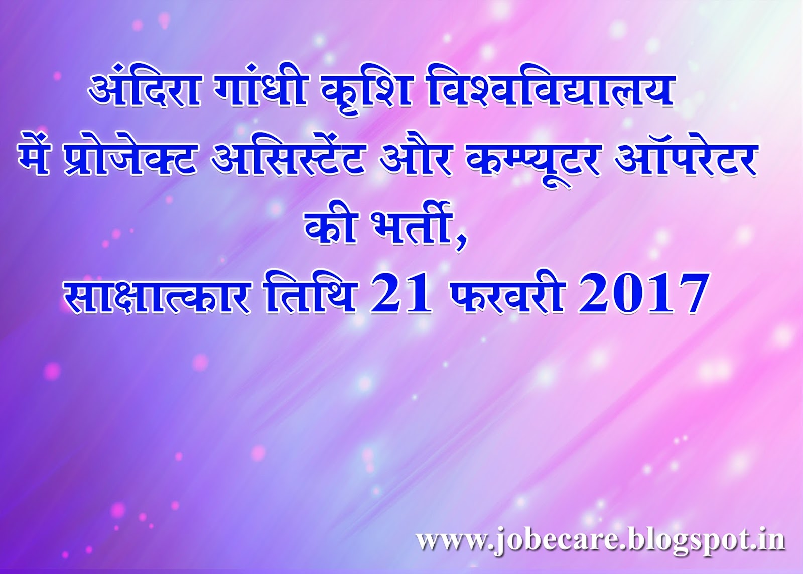 IGAU Recruitment _ इंदिरा गांधी कृषि विश्वविद्यालय में प्रोजेक्ट असिस्_टेंट और कम्प्यूटर ऑपरेटर पदों की भर्ती, साक्षात्_कार तिथि 21 फरवरी 2017